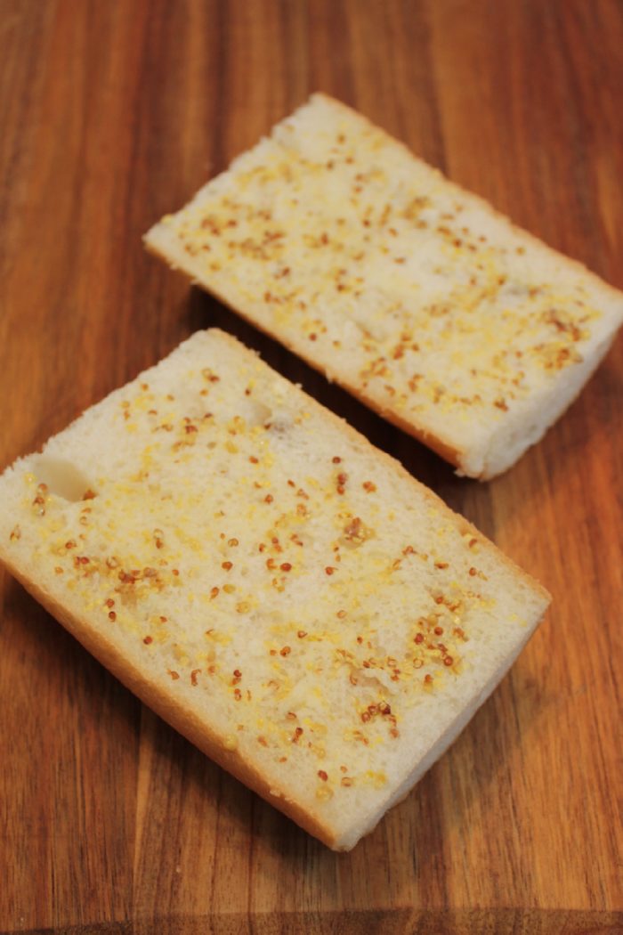 - Baguette, sliced into 6 equal pieces, each sliced in half