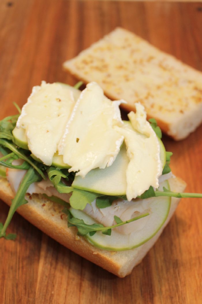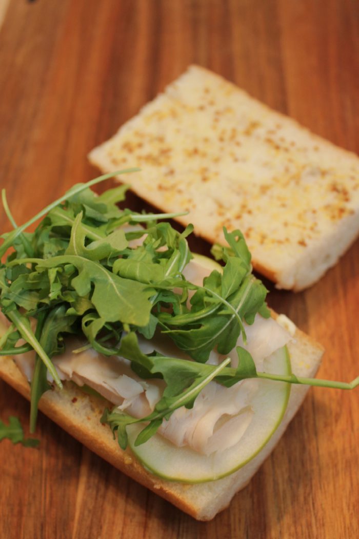 - On the bottom slice of bread, layer on: brie, apple, turkey, arugula, apple, brie. Top with the upper piece of bread.