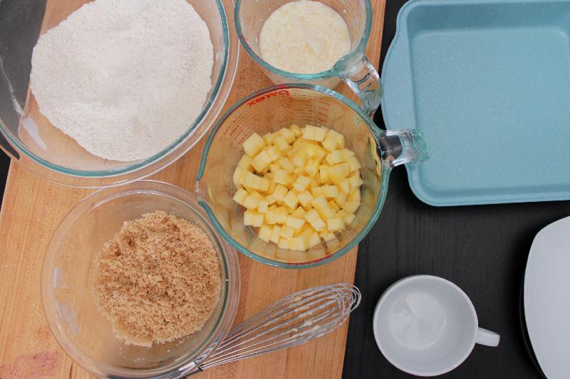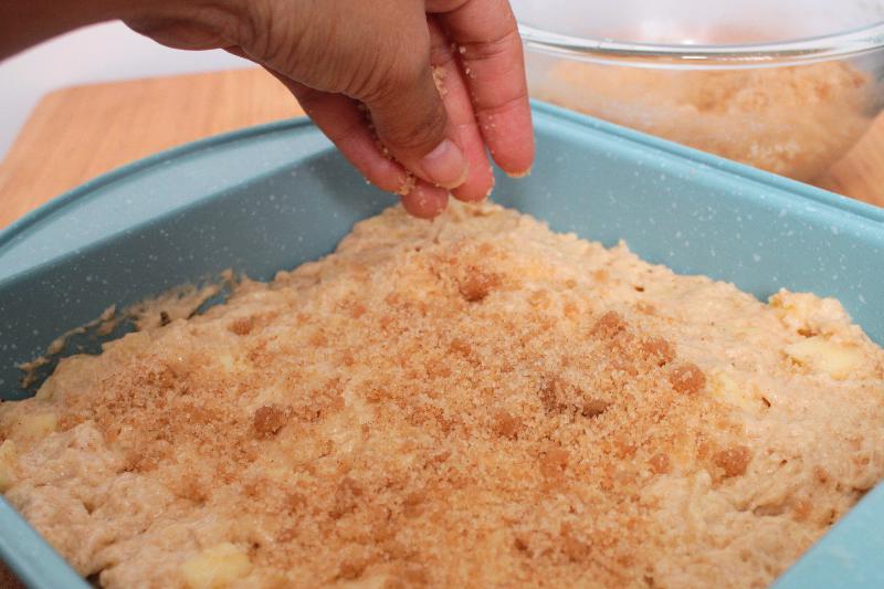 - Mix together dry ingredients, wet, and apples. Spoon into pan and gently smooth top.