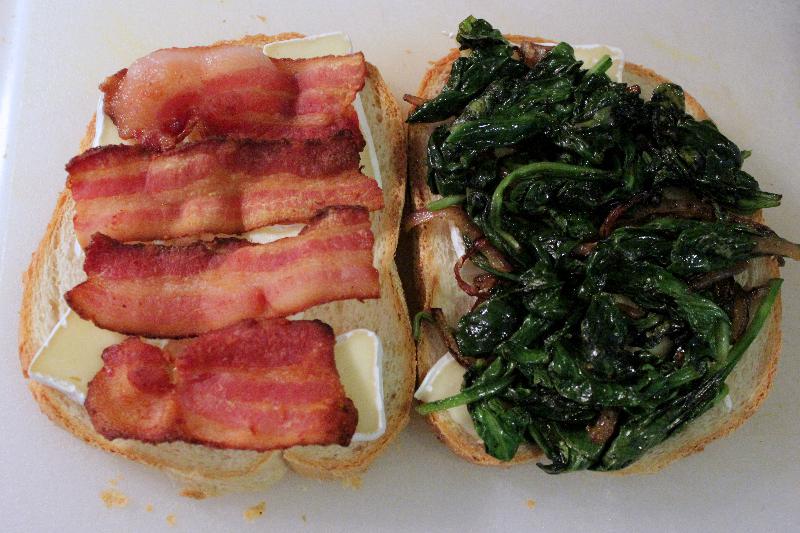 Today’s thing is National Grilled Cheese Day! Thus I have made for you a meal that combines three of my favorite things: buttered toast, brie cheese, and BACON. I also added some sauteed spinach and red onion for health/flavor (shallot would also work). It’s easy, it’s delicious, and it’s easily scaled into as many sandwiches as you desire.