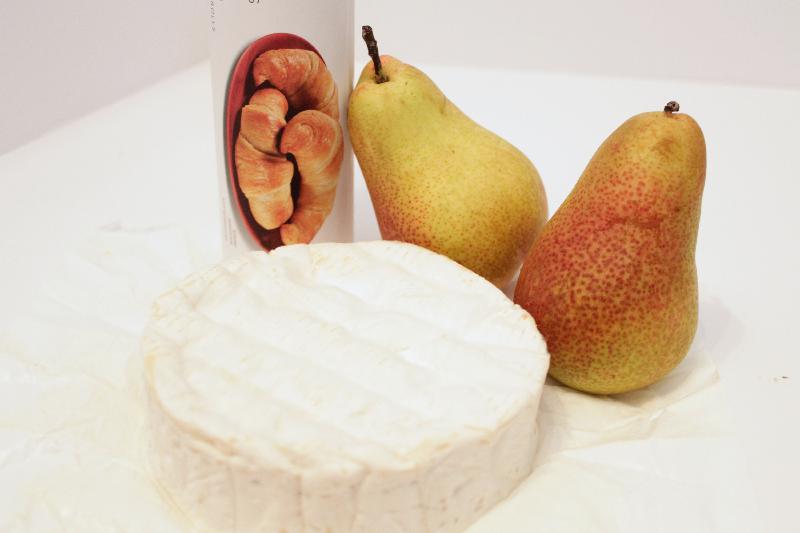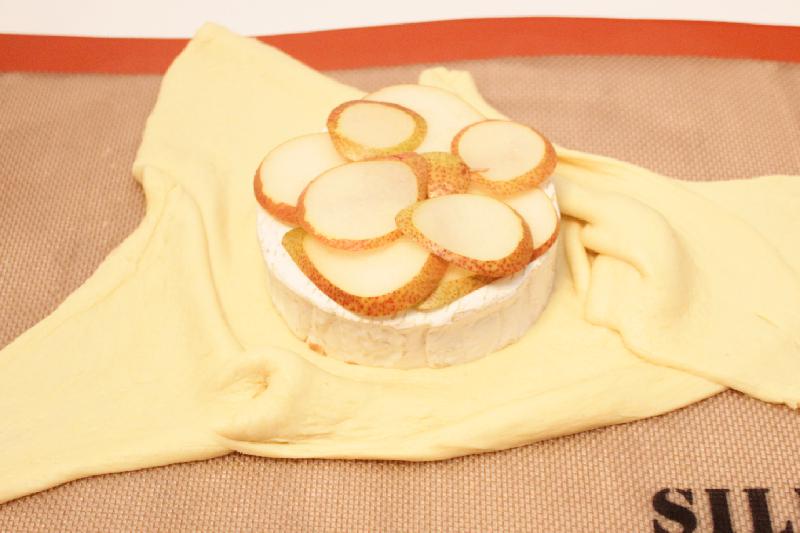 - Place the brie in the center of the dough and layer pear slices on top. Wrap with dough, making sure to cover the cheese completely.