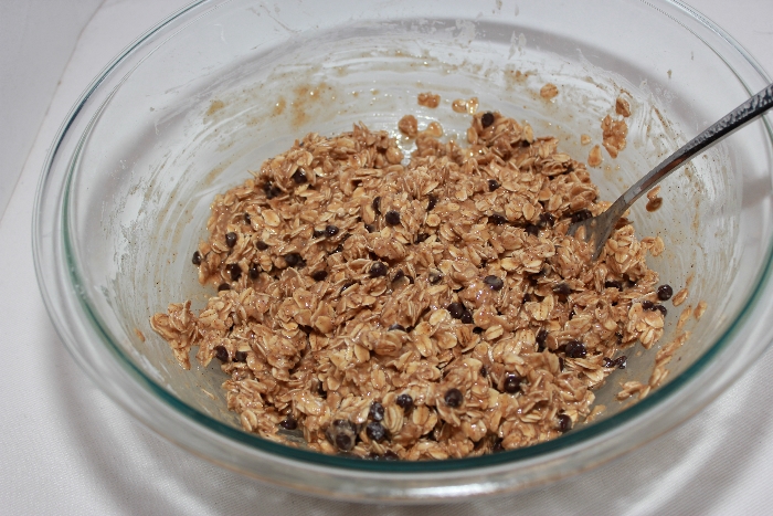 - Add the oats, flour, baking powder, and stir to combine. Stir in the chocolate chips. The batter will be wet; don’t worry about it.