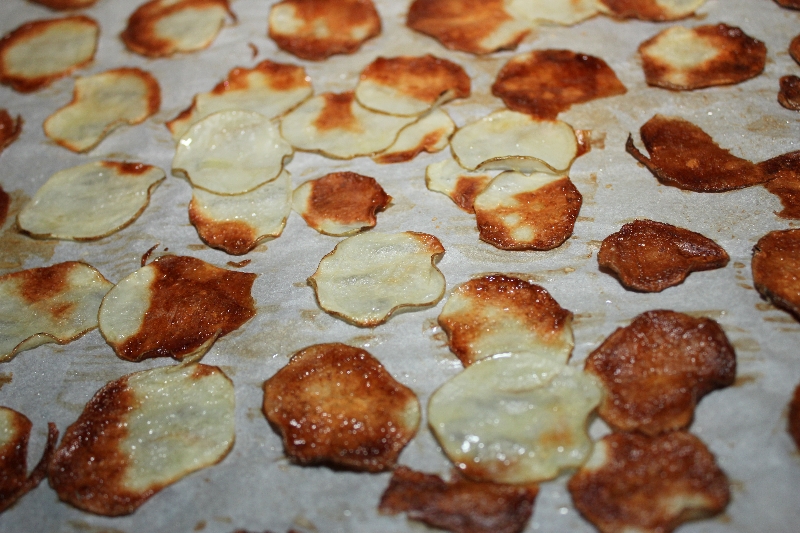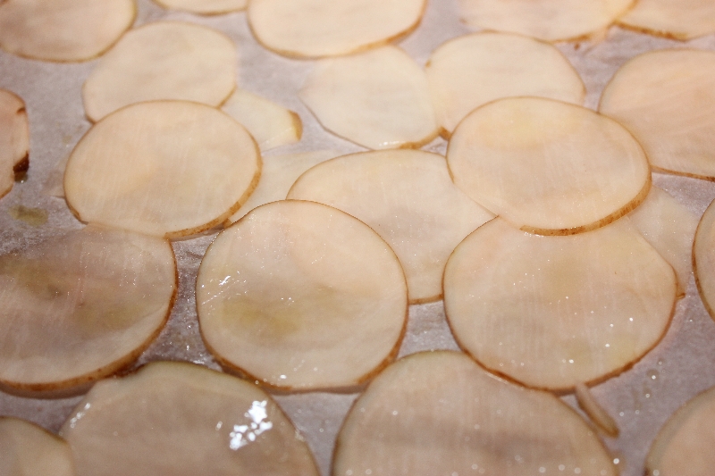 - Use a mandoline or a knife to slice potatoes very very thin. Lay out on the baking sheet (I found that I could just squish one whole potato’s worth of slices onto one baking sheet). Brush with olive oil and sprinkle liberally with salt. Bake for 8-12 minutes, checking often to achieve desired crispiness.