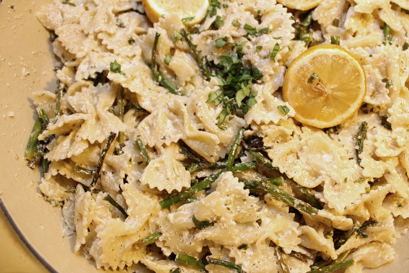 - Toss the pasta and asparagus with the sauce. Serve with perfectly squeezable lemon halves on the side.