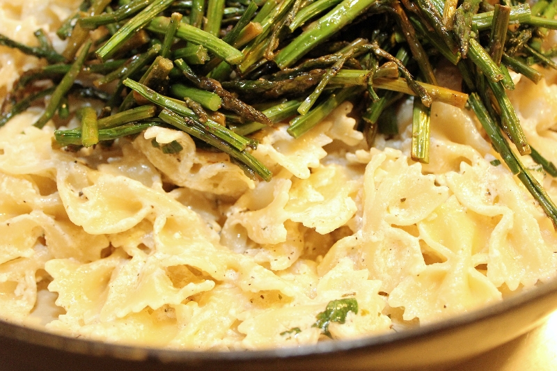 A marriage of savory and tangy, toothsome and smooth. Goat cheese makes this pasta light but rich; charred asparagus adds a great savory flavor.