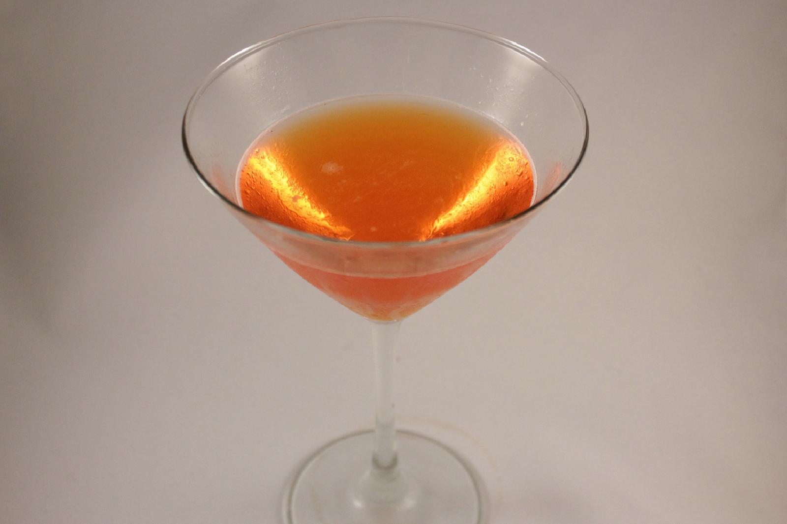 - Shake all ingredients vigorously over ice for ten seconds. Strain into a chilled martini glass. Serve!