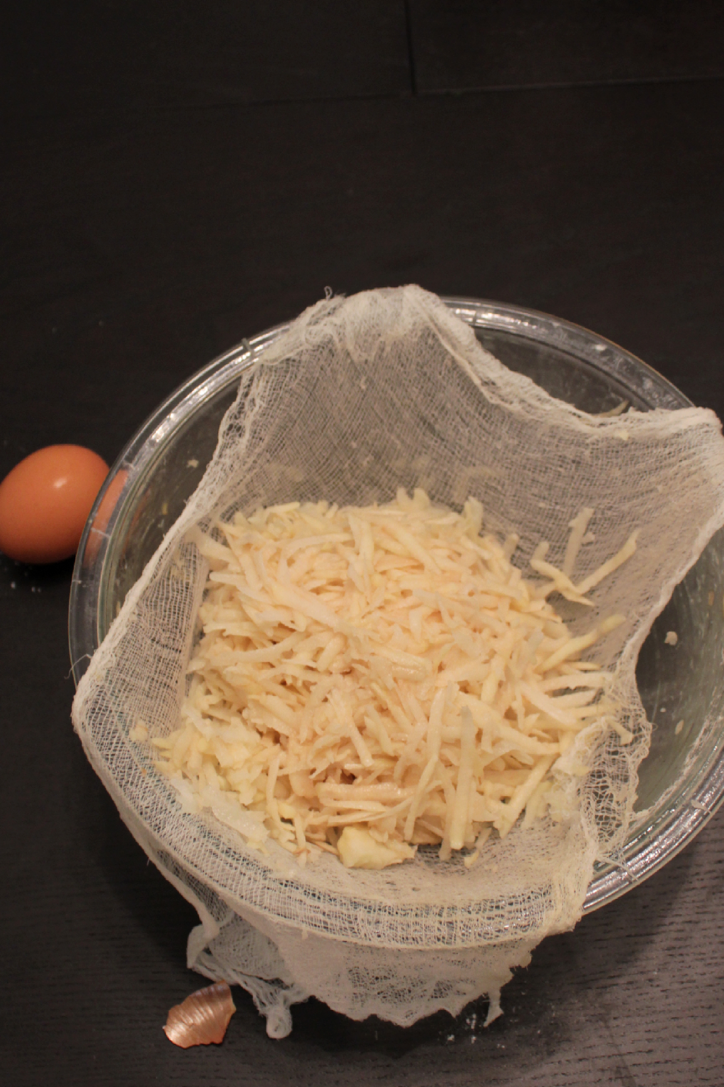 - Drain excess liquid out of potatoes and onions by wrapping in a cheesecloth and squeezing. Let sit for 2 minutes, then squeeze again.