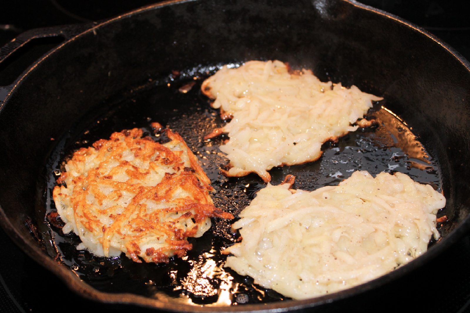 I went a bit off-book here and grated a clove of garlic into my latkes, and topped them with sour cream and green onions (chives are also great!). They were AMAZING. If you like them with applesauce or jam or something sweet, skip the garlic.