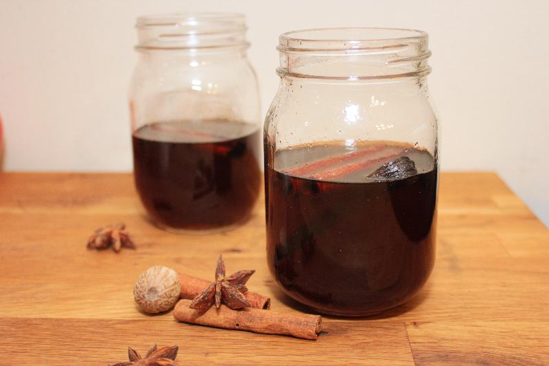 - Pour through a mesh strainer into a jar or other storage container. Return the vanilla bean and cinnamon sticks to the jar for a little extra flavor and color.