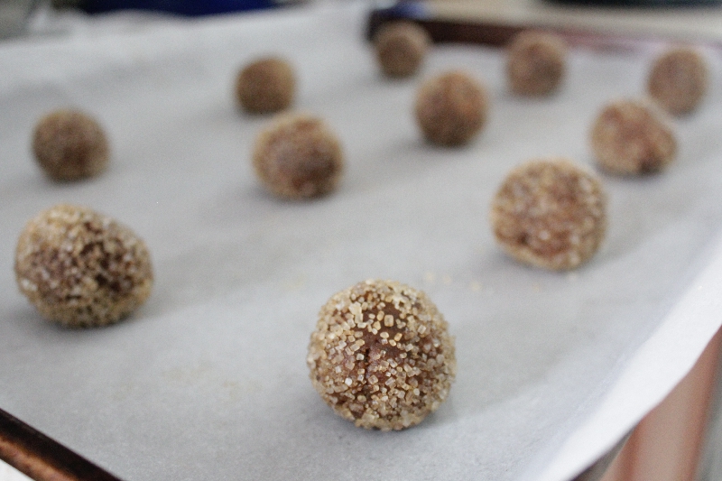 Roll dough into balls about 1.5″ in diameter. Roll in raw sugar and place on baking sheet.