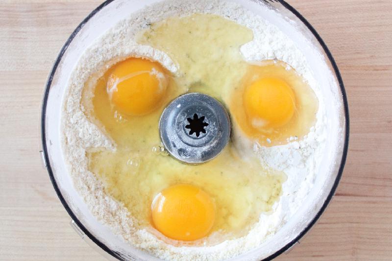 - Add eggs. Process for about 30 seconds, or until the mix suddenly becomes one coherent ball of dough.