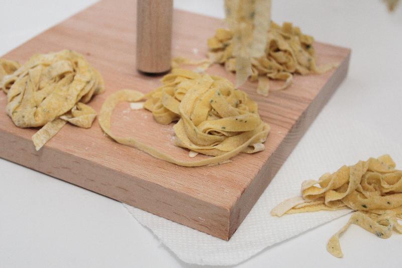 - When it reaches your desired thickness, run it through a pasta shaper or use a pizza cutter to cut it into ribbons, squares, etc.