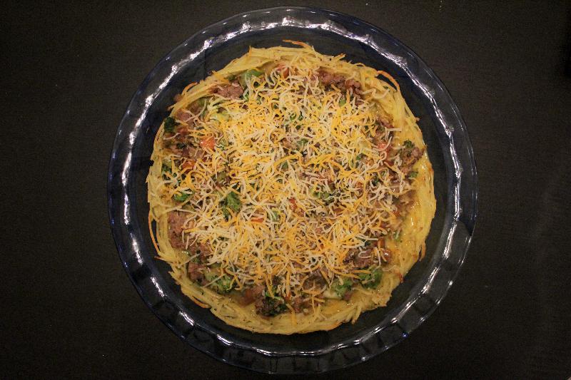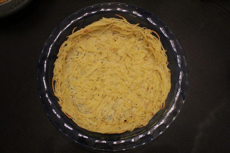 - Combine shredded potatoes, oil, salt, and pepper. Press into pie pan in an even layer, building the sides up as high as possible. Bake for 20 minutes, or until the edges are beginning to brown.
