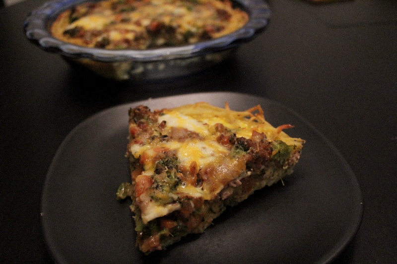 Here’s where the “no-recipe” comes in. I used what I think is a deep dish pan, 9.5″ across and 1.5″ deep. The filling is roughly 1/3 pound of meat, 3 cups vegetables, and 1 cup cheese. Specifically, I used Italian sausage, carrots, onions, and broccoli. I’ve had other quiches that worked well with zucchini, mushrooms, or spinach. The world is your quiche oyster!