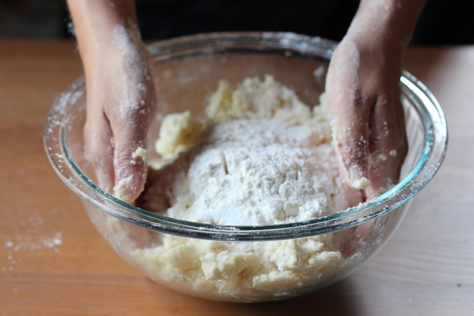 - In a large bowl or on a clean surface, stir together two thirds of the flour with sugar and salt. Add in butter chunks and use your clean hands to squash the butter pieces into the flour mix, until dough begins to clump and no dry flour remains.
