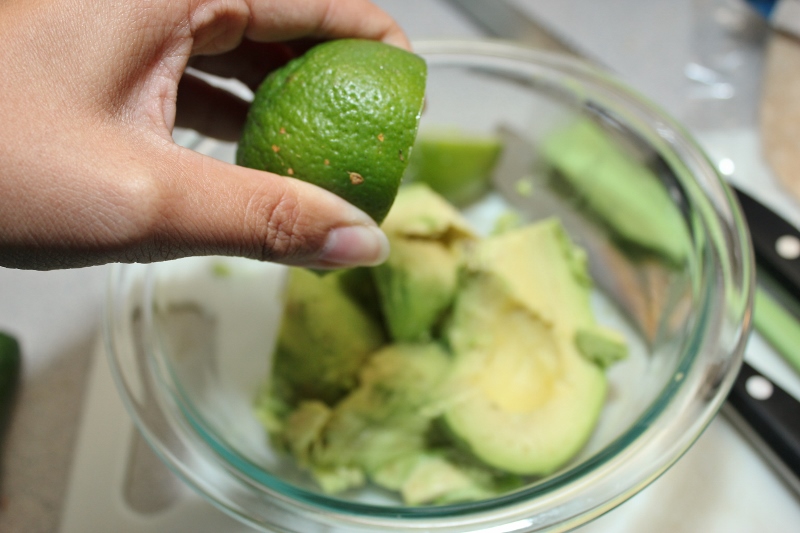 - Cut the avocados in half and scoop the squishy green parts into a bowl. Mash them up to your desired consistency. Stir in the lime juice to keep the avocado from turning brown while you work.