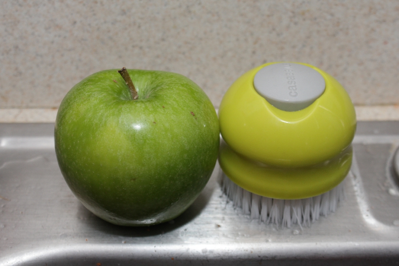 In my other recipes this week (here and here), I’ve advocated using sweet apples where tart ones might be traditionally used. For this savory galette, I went ahead and used the tart apple. This apple is sitting next to a 2 ‘n 1 Veggie Brush from Casabella, which is a great tool if you’re the kind of person who’s squicky about using your dish sponge for other applications (let’s not talk about how many germs live in the kitchen sponge. I’m in denial). I didn’t show it here, but the gray part pops out to be a tiny, even softer brush for mushrooms! How cute is that?