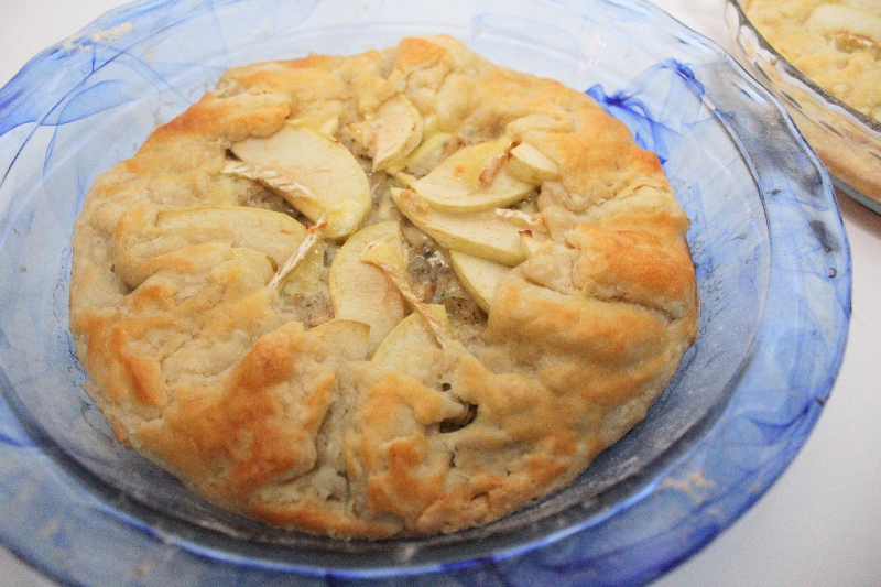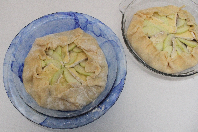 - Pour filling into dough, leaving a 1″ margin around the outsides; trim off any excess crust. Lay sliced apple and brie on top of the filling.