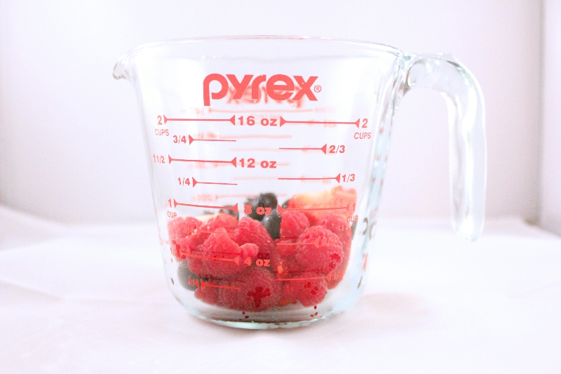 - 3/4 cup sliced berries (I used 4 strawberries, 8 raspberries, 16 blueberries)