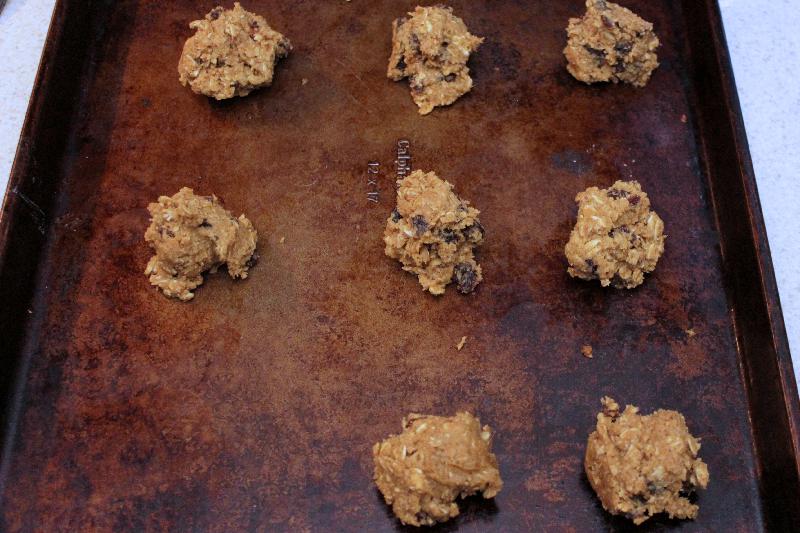 5. Mix together wet and dry ingredients with oats and raisins, just until no flour is visible.