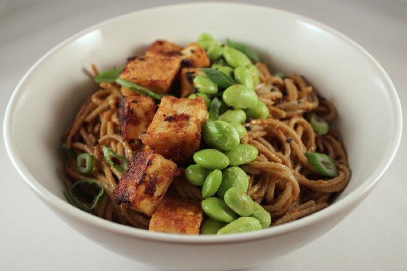 - Toss soba noodles with remaining sauce. Served topped with tofu and edamame, green onions and sesame seeds. Enjoy!