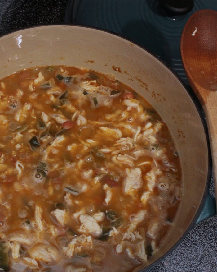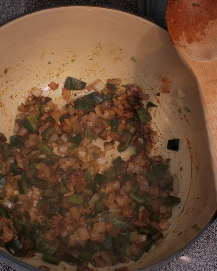 - Heat oil in a Dutch oven or stock pot over medium heat. Saute garlic, peppers, and onion until soft, about 5 minutes. Add spices and cook for another minute. Stir in chicken broth and lime juice and bring to a simmer.